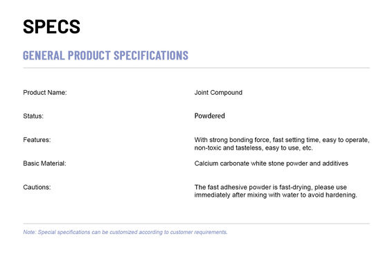 پودر چسب سریع به سرعت خشک می شود، لطفا بلافاصله پس از مخلوط کردن با آب برای جلوگیری از سفت شدن استفاده کنید. |